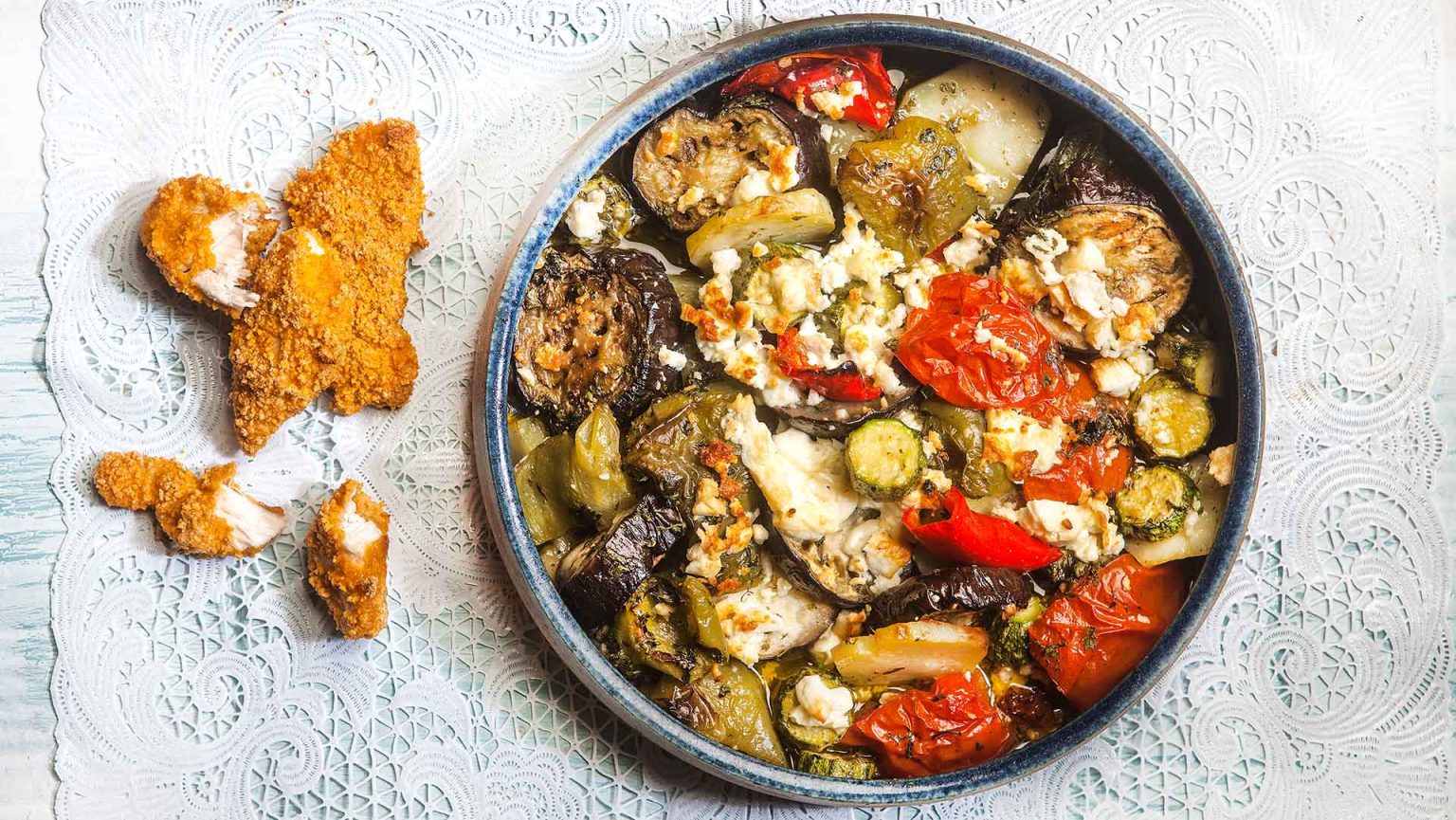 Αφού πλύνουμε και καθαρίσουμε τα λαχανικά, κόβουμε τις μελιτζάνες σε 6 κομμάτια, τα κολοκύθια στα 6 (σαν μεγάλες μπουκιές), 4-5 εκ. (θα μικρύνουν στο ψήσιμο), τις ντομάτες στα 4 και τις πατάτες. Καθαρίζουμε ίνες, σπόρους και κοτσάνια από τις πιπεριές και τις κόβουμε στα 4.