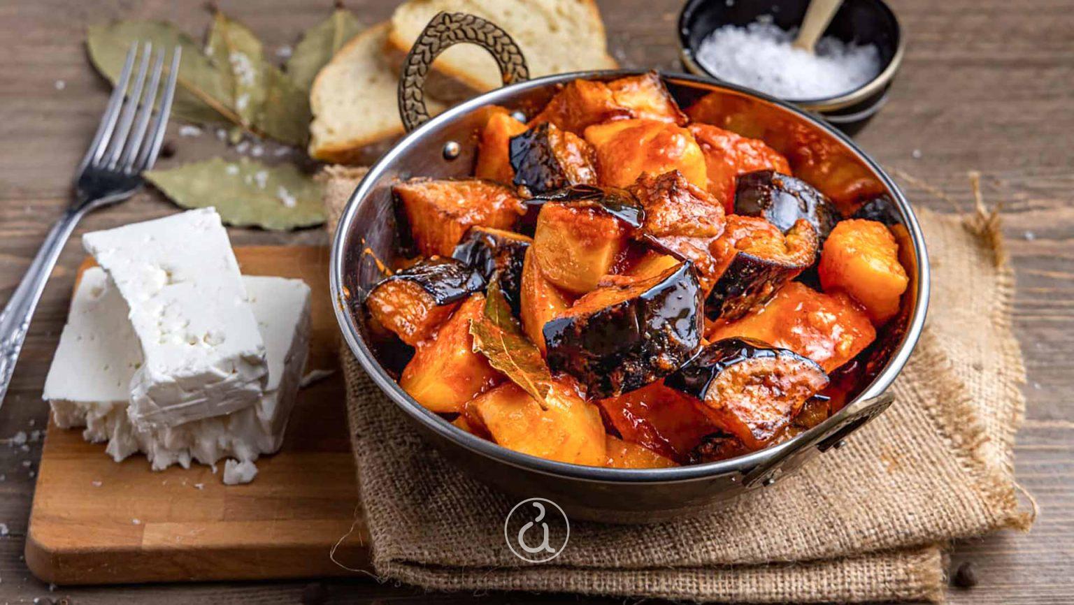 Προσθέτουμε τις πατάτες και τις μελιτζάνες και ανακατεύουμε τα υλικά, να λαδωθούν.