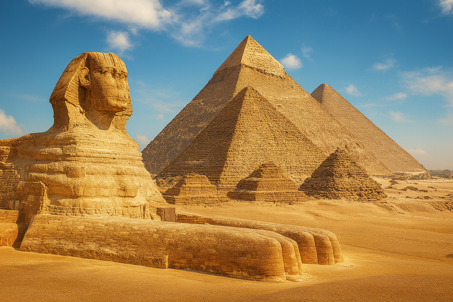 Η Σφίγγα και οι Πυραμίδες της Γκίζας υψώνονται αγέρωχες στην αιγυπτιακή έρημο.
