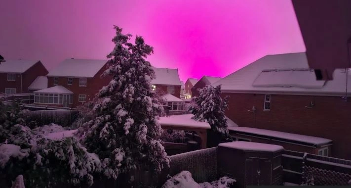 Ο ουρανός στα Δυτικά Μίντλαντς απέκτησε ξαφνικά μία εκθαμβωτική ροζ απόχρωση το βράδυ της Πέμπτης, καθώς έπεσε έντονη χιονόπτωση κατά τη διάρκεια της καταιγίδας «Γκορέτι«. Οι εικόνες που κυκλοφόρησαν δείχνουν το φαινόμενο στο κέντρο της πόλης του Μπέρμιγχαμ, αλλά και στο Χέντνεσφορντ, στο